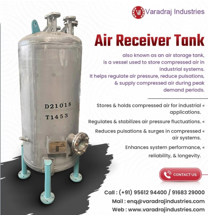 An Air Receiver Tank is a pressure vessel used to store compressed air before it enters the piping system. It helps in stabilizing pressure fluctuations, reducing compressor load cycles, and removing moisture from the air.